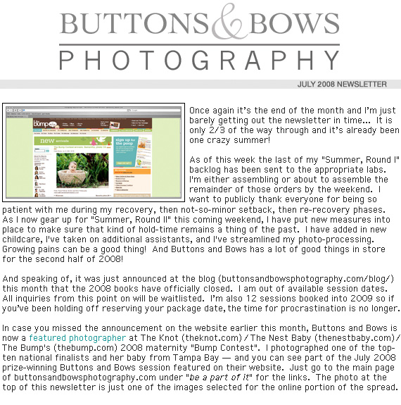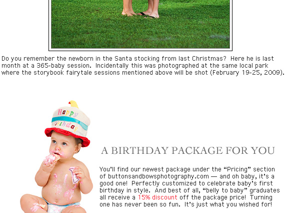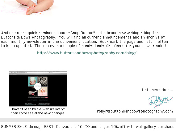 ![]() ![]() ![]() ![]() ![]() our designer announcement collection: http://www.buttonsandbowsphotography.com/print/announcements.html if you have trouble viewing HTML mail go to: http://www.buttonsandbowsphotography.com/mail/July08/ miss one? click here to view last newsletter: http://www.buttonsandbowsphotography.com/mail/June08/ ![]() to unsubscribe from newsletter: http://www.buttonsandbowsphotography.com/unsubscribe.html |